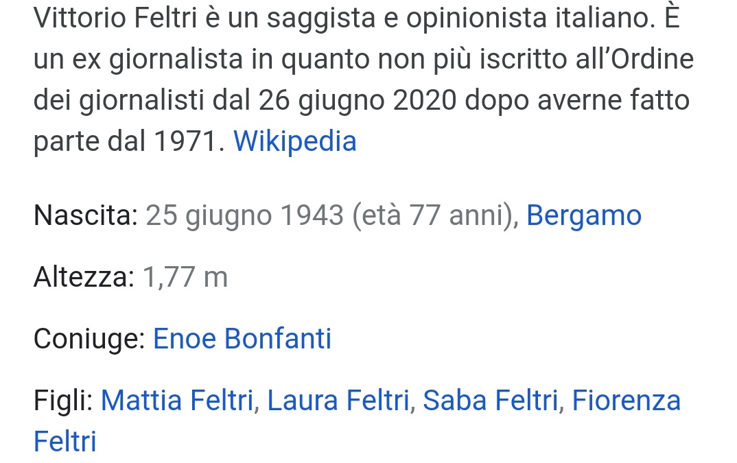 E basterebbe guardare le cifre che descrivono il suo pubblico, sia come direttore la strategia dei feltri è quella del bullo che cerca attenzione. Vittorio feltri per libero quotidiano vittorio feltri i lapidatori sono instancabili. L'eredità, vittorio feltri infuriato con 'la ghigliottina: Io ho fondato libero molti anni fa, che è un quotidiano nato e cresciuto nel brodo del centrodestra e dove continuerà a stare. Ecco quanto dice iodice, chiaramente in chiave ironica: La rabbia di vittorio feltri contro mario draghi: « vittorio, avrei voglia di qualcosa di buono. Ho letto vari commenti post elettorali e ne ho tratto l'impressione che il pd abbia vinto la guerra mondiale scrive feltri nel suo editoriale. Oggi vittorio feltri, parlandone come da vivo, ha deciso di dare ancora spettacolo di sé pubblicando un coccodrillo su andrea camilleri come se lo scrittore fosse già morto. Due giorni di chiacchiere vane in parlamento e nessuno che si preoccupa di comprare i vaccini che sono l'unica salvezza. 20 risultati per vittorio feltri. (feltri su dino boffo, pensando già a fini). Juni 1943 in bergamo) ist ein italienischer journalist.